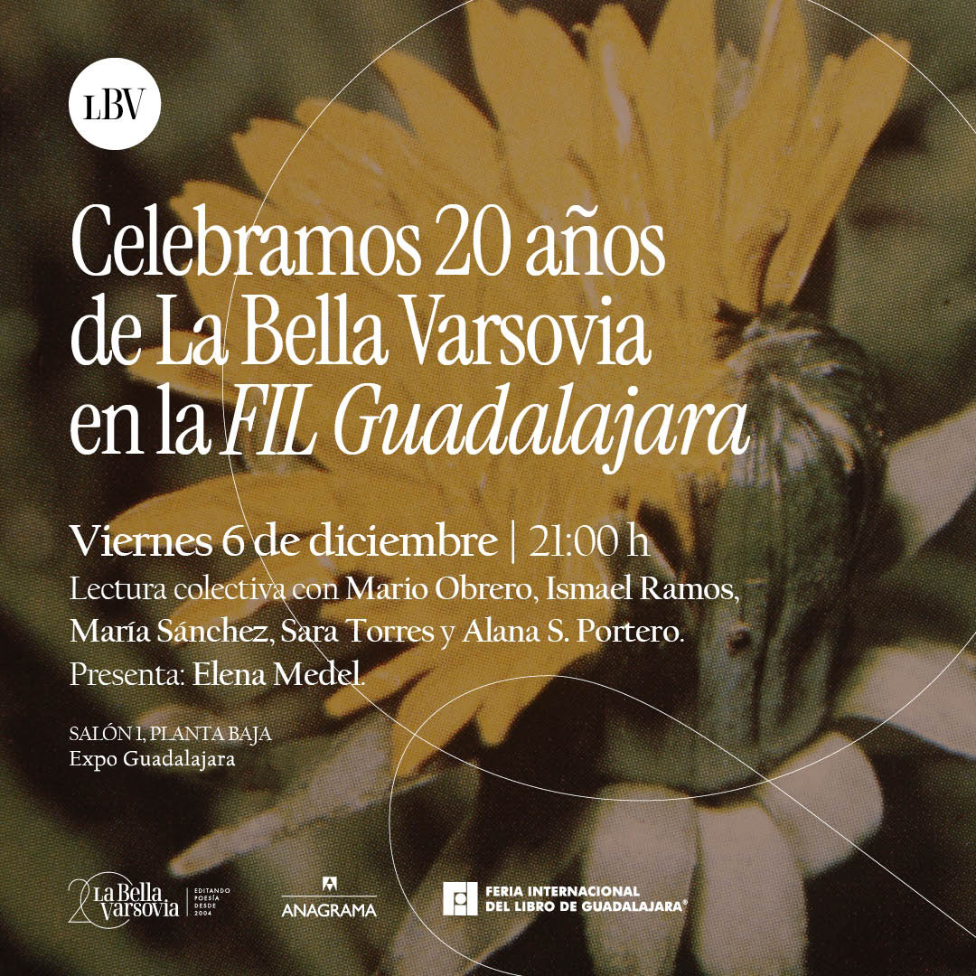 El viernes 6 de diciembre a las 21 h (Salón 1, planta baja, Expo Guadalajara) celebraremos los 20 años del sello de poesía La Bella Varsovia con una lectura colectiva en la que participarán Mario Obrero, Ismael Ramos, María Sánchez, Sara Torres y Alana S. Portero, quién se suma al catálogo el próximo año. Conduce el acto la escritora y fundadora de La Bella Varsovia, Elena Medel.